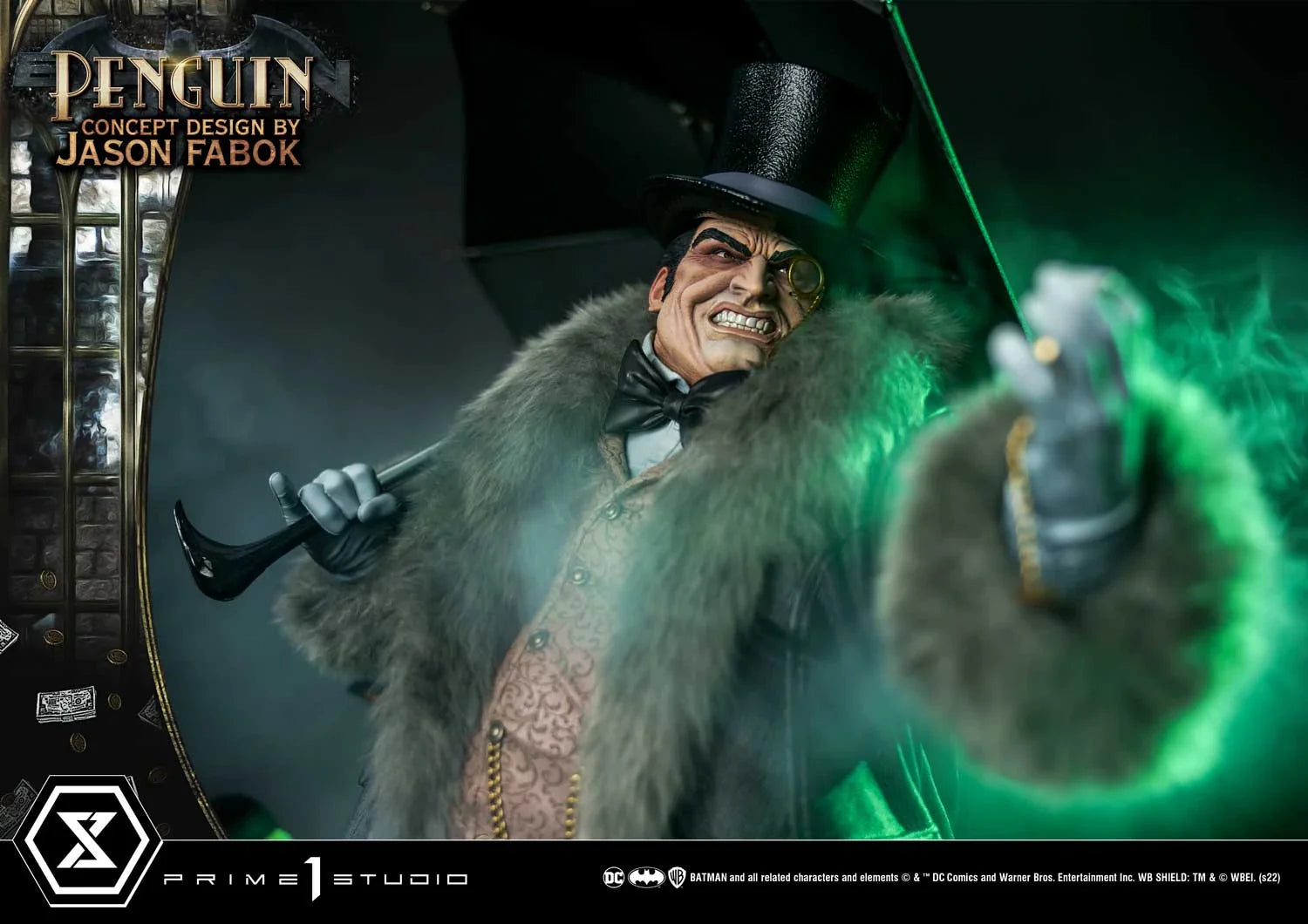 Our talented sculptors and painters at Prime 1 Studio enjoyed bringing Jason Fabok’s latest statue come to astonishing life. They have imbued this 24.8-inch-tall Penguin collectible statue with as many real-world textures and as much realistic detailing as they could. The Penguin looks ready for a night out on the town! Decked out in his top hat, fur-lined leather coat, and one of the many umbrellas in his arsenal, Mr. Cobblepot looks like a man at the top of his game.