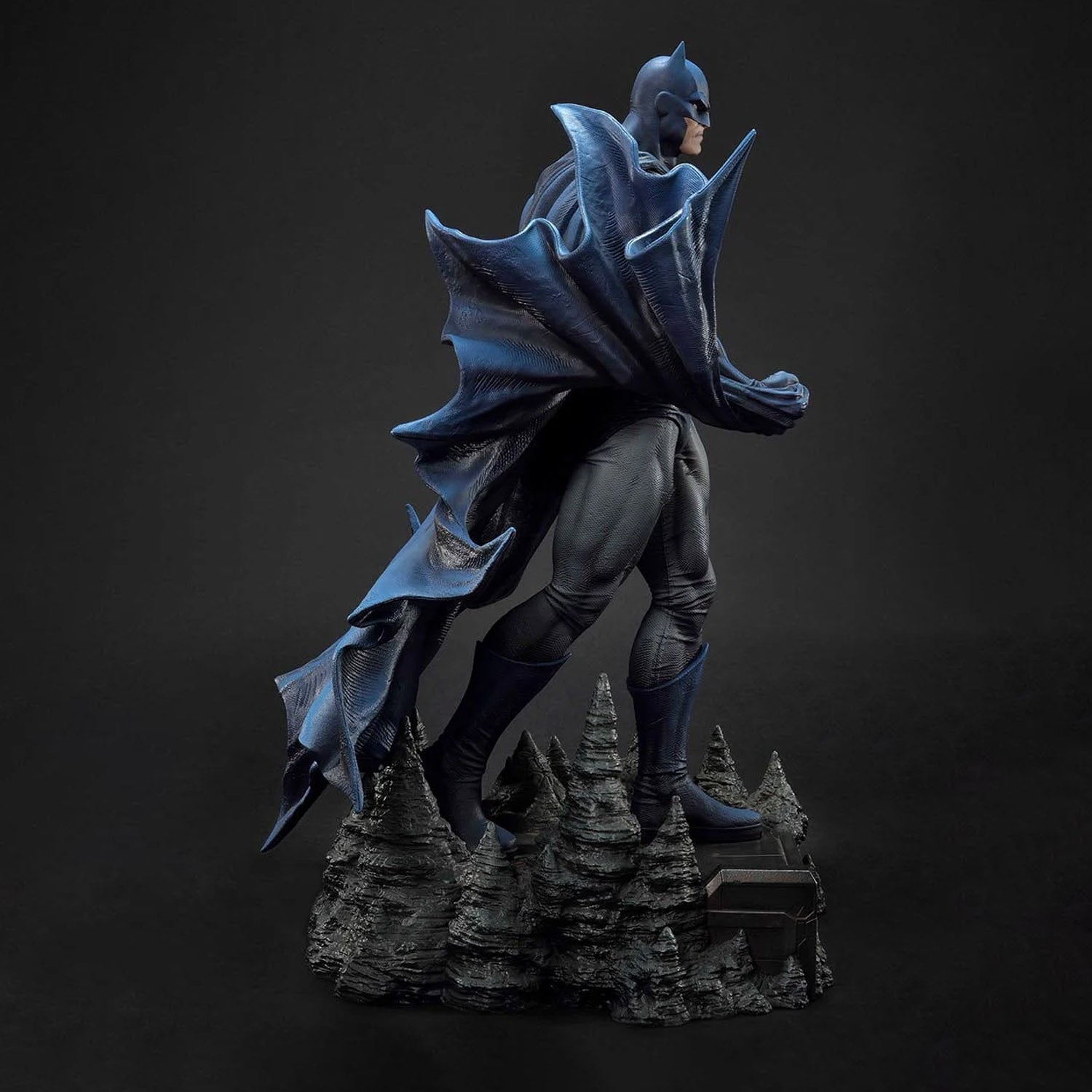 Batman emerges from the Batcave, his cape billowing dramatically, evoking the dynamic scenes from the comic. His biceps, forming his broad shoulders; his pectorals, lifting the Bat-symbol; and his quadriceps, supporting his powerful leg strength—all the characteristic features of the legendary penciler’s depiction of Batman—are meticulously sculpted, complete with comic-style shadows that bring the figure to life.
