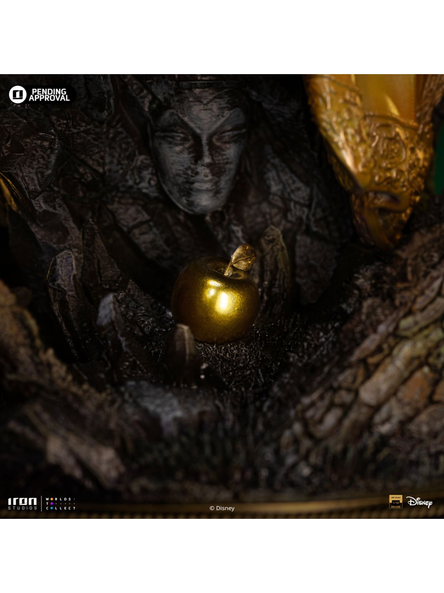 Exploring the Snow White statue: Seated gracefully on her long yellow dress on top of a large tree trunk in a lush forest, a young woman with ebony-black hair and snow-white skin, blessed with impeccable and enchanting beauty, wearing a navy blue bodice adorned with gold trim, puffed sleeves in shades of blue, red, and white, and a high white collar with a black cape lined in scarlet on her back, seeks refuge in the forest while surrounded by woodland creatures. Cradling two small hares in her lap, she is accompanied by squirrels, a fawn, and a blue jay perched delicately on the fingers of her right hand, her kindness and purity of spirit bring comfort and trust, allowing the animals to gather around her without fear. Resting on an intricately detailed diorama base featuring references such as the sculpted visage of her wicked stepmother on the rocks below and a beautiful yet deadly golden enchanted apple, the statue is inspired by the masterful painting "With a Smile and a Song" by Heather Edwards. Iron Studios proudly presents the "Snow White by Heather Edwards - Disney - Deluxe Signatures" statue, inaugurating the Deluxe Signatures series, which portrays the finest works of painted art into meticulously detailed three-dimensional sculptures.