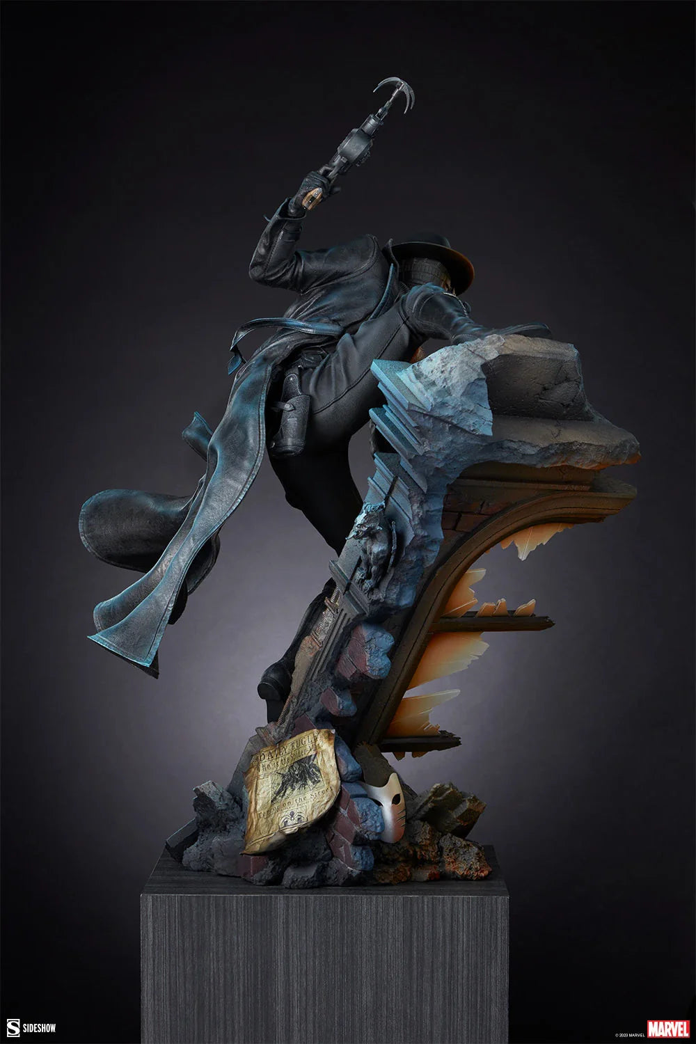 It’s a cold, dark night on Earth-90214, also known as Earth-Noir. The Great Depression sweeps New York City and super heroes are practically unheard of — until along swings a Spider-Man. The Spider-Man Noir Premium Format Figure measures 26.75” tall and 21” wide in a dramatic, dynamic display angled along a dilapidated building. This massive Marvel statue is packed with detail from the tip of his grappling hook to the bottom of the rubble-covered base. Use your private investigator skills to spot Easter eggs including a newspaper article with references to the original comic series, Felicia Hardy’s White Widow mask, and a gargoyle design paying tribute to Peter Parker’s adventures in another timeline.