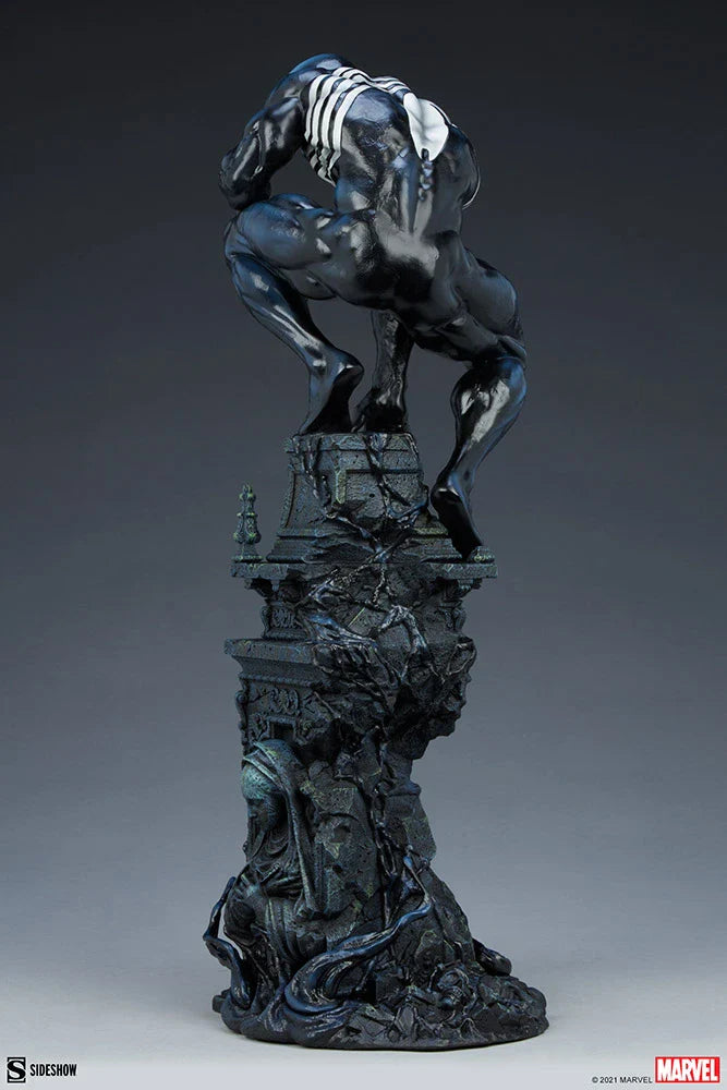 The Symbiote Spider-Man Premium Format™ Figure measures 24” tall as everyone’s favorite wall crawler crouches atop a crumbling church bell tower. Tendrils of the Klyntar symbiote substance wind their way up the detailed tower base, eager to reunite with their host. The tower beneath him features realistic stonelike textures as well as crumbling reliefs depicting a weeping woman and a skeletal figure.
