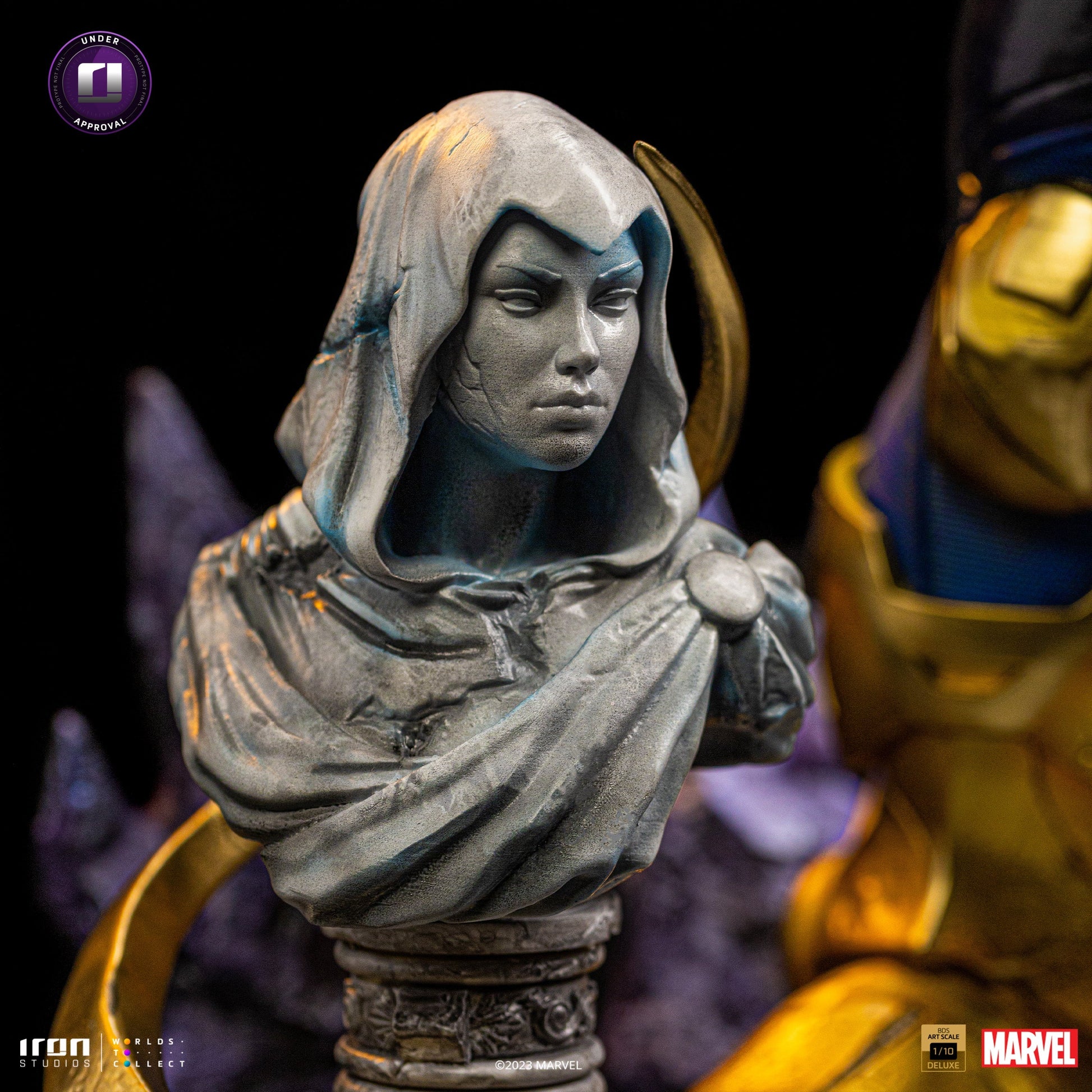 On the base of a temple built to pay homage to Lady Death herself, the Titan raises his gloved left hand with his Infinity Gauntlet, flaunting the power of a demigod with this artifact made to store six cosmic singularities transformed into stones, each of them representing an aspect of the universe: the space, the time, the mind, the power, the soul, and the reality, making its user almost omnipotent. In love with the personification of Death in the shape of a beautiful woman, his plans usually include universal genocide to court his beloved, portrayed in the statue next to him in the form of a bust on a pedestal. Crazy, eternal, and inevitable, he is all that and much more, and answering the request of fans and collectors, Iron Studios proudly present the statue "Thanos Deluxe - Infinity Gauntlet Diorama - BDS Art Scale 1/10", the first of a new series composed by the most powerful heroes on earth from the universe of Marvel, in a collection that will form another incredible battle diorama set.