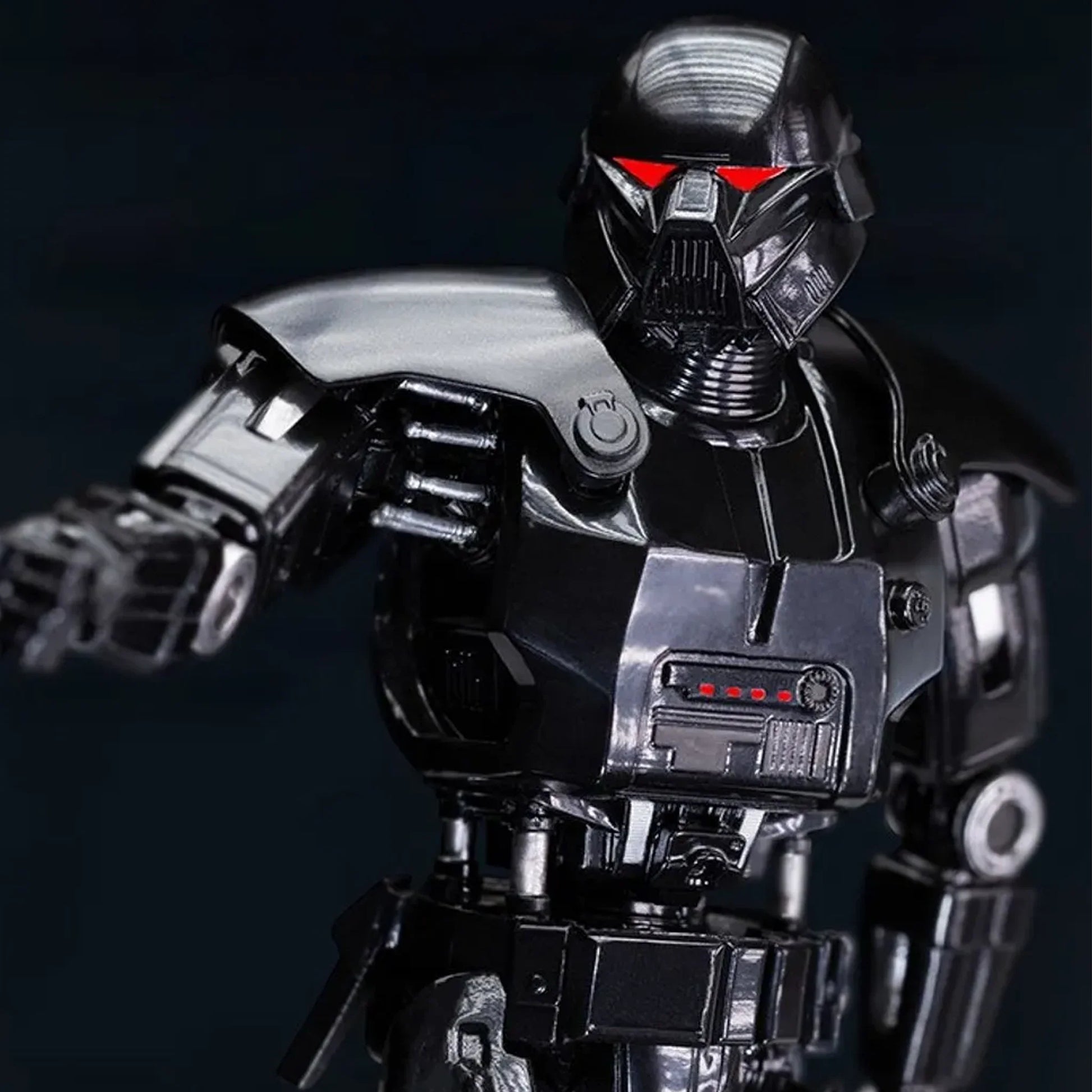 A figure covered in shining black armor is aboard Imperial Officer Moff Gideon's space cruiser, directing his red photoreceptor eyes towards his objective, wielding a large blaster rifle and ready to fire with precision at any target. Iron Studios thus presents its statue of the fearsome "Dark Trooper", one of the most efficient and powerful Imperial combat droids. Just as seen in the second season of The Mandalorian series, a spin-off from Star Wars on the Disney+ streaming channel. Unveiled firsthand in the Sideshow Con virtual event, a must-have for Star Wars fans and collectors, the statue has two pairs of interchangeable hands, giving you the option of different ways to display.