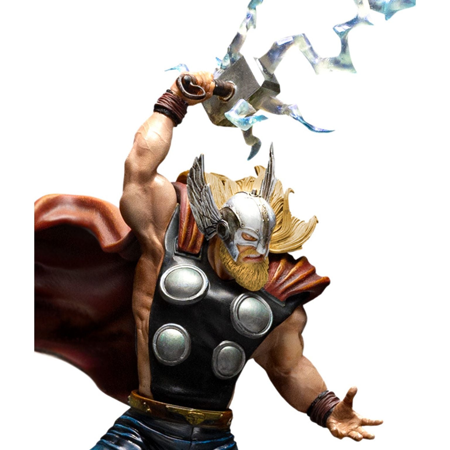 At a unique place beyond space and time, the fearless God of Thunder summons the strength of lightning with his mystic hammer, jumping over the spiky rocks of a temple built to pay homage to lady Death herself, against the threat of the mad titan called Thanos, boasting the power of a demigod with his Infinity Gauntlet. With his red cape moving like big wings and showing in his countenance the fury of a warrior in the extra interchangeable head with his combat helmet, partially covering his face and exposing his long hair and beard, the Viking warrior god joins forces to other mighty heroes to save the universe.