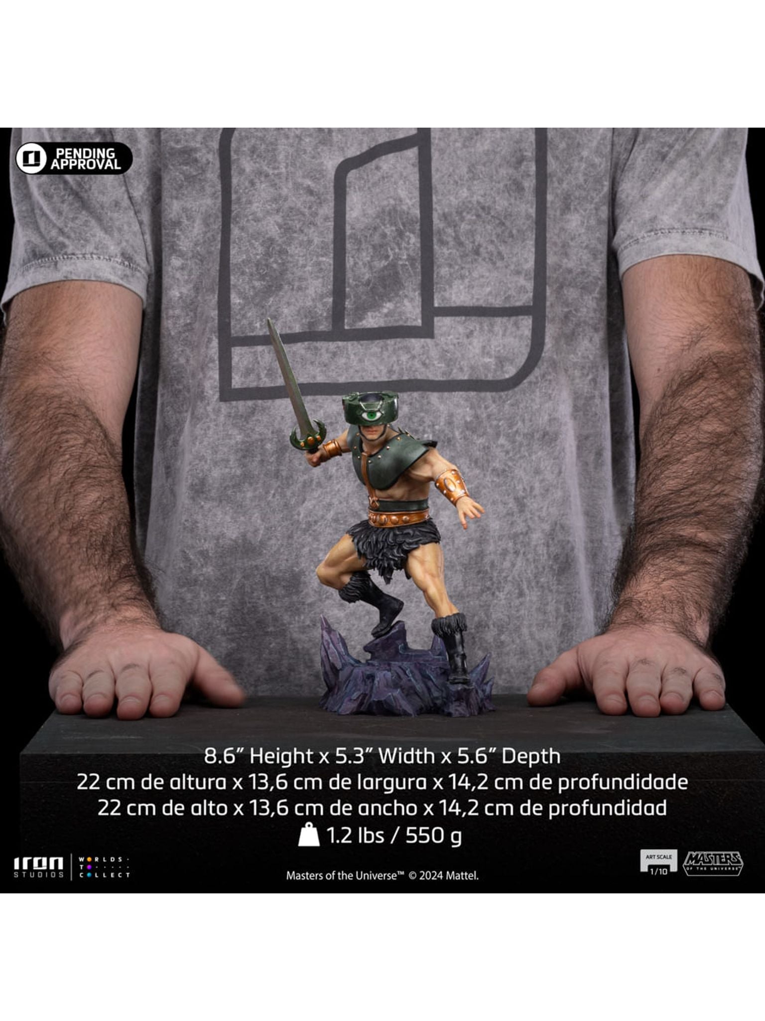 Wearing his signature green armor with fur and ready for battle against He-Man and his allies, standing on top of a jagged rock base, we can see Tri-Klop’s mastery in combat. Wielding a sword in his right hand, with daggers strapped to his back, his greatest weapon is the defining feature of his character, his rotating helmet with three distinct eyes, allowing him to see from great distances, in complete darkness, and even through solid objects. This is the "Tri-Klops – Masters of the Universe – Art Scale 1/10" statue by Iron Studios, featuring another villain from Eternia.