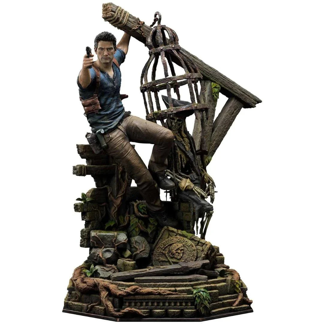 In this thrilling 27 inch tall statue, Prime 1 Studio artists have posed an extremely acrobatic Nathan Drake in the midst of yet another exciting adventure. Nathan hangs off a wooden beam, supporting a cage inhabited by a long dead crewmate of the famed pirate, Henry Avery! Nathan aims his trusty sidearm at an unknown combatant, who is bound to lose his life in this encounter!